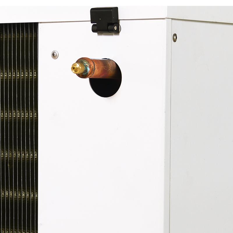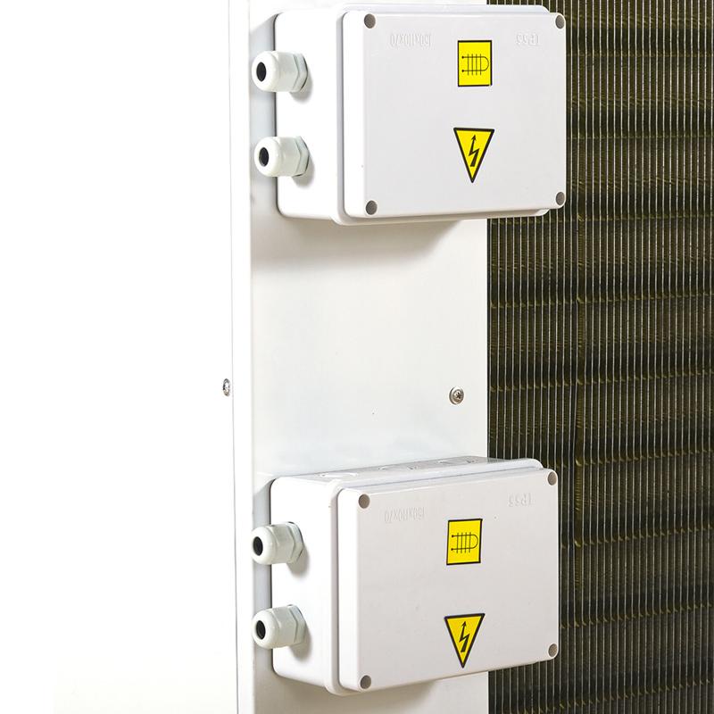 标准采用电热除霜,不锈钢加热管均布于盘管翅片中及内水盘板上,独立的加热管接线盒。