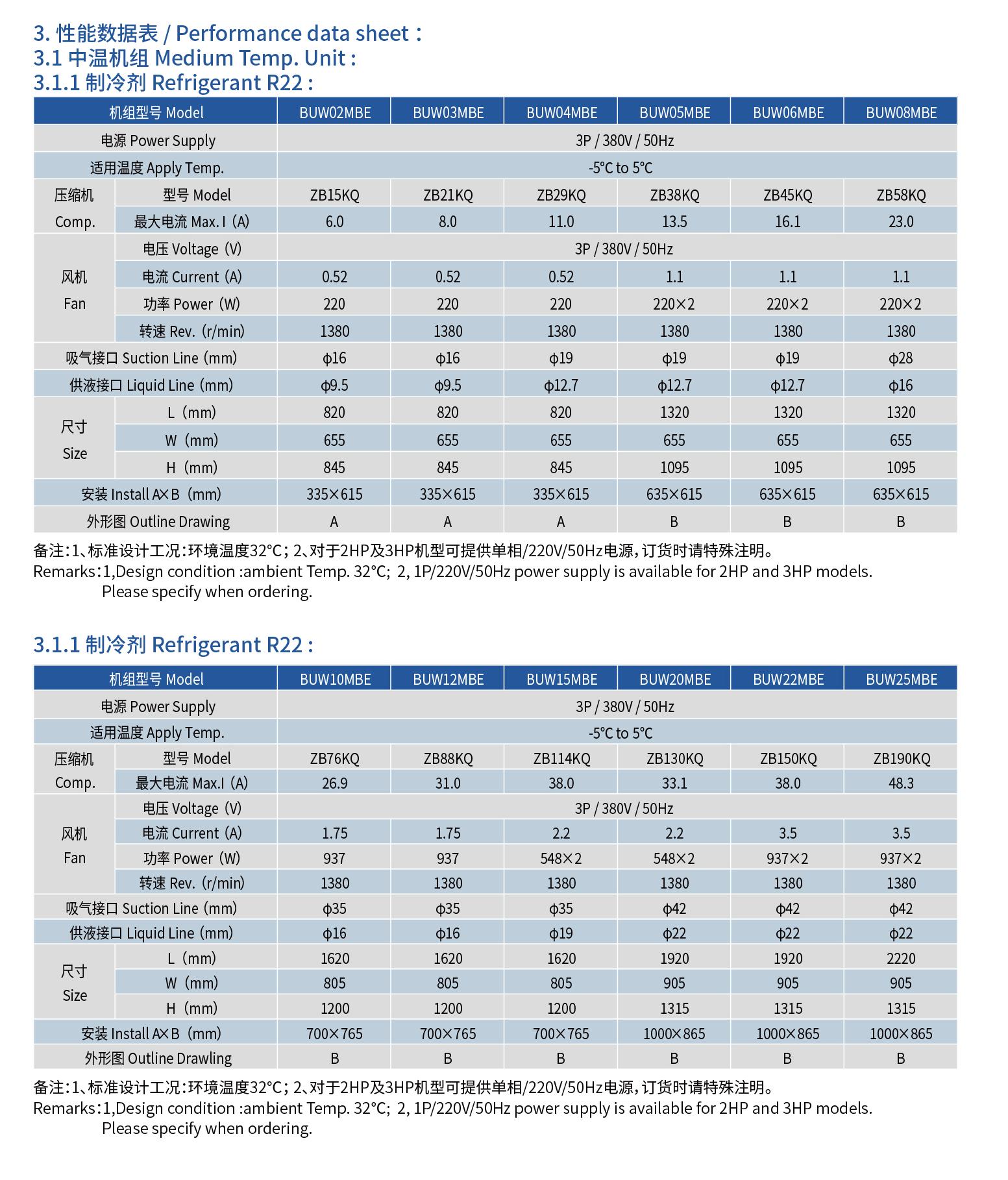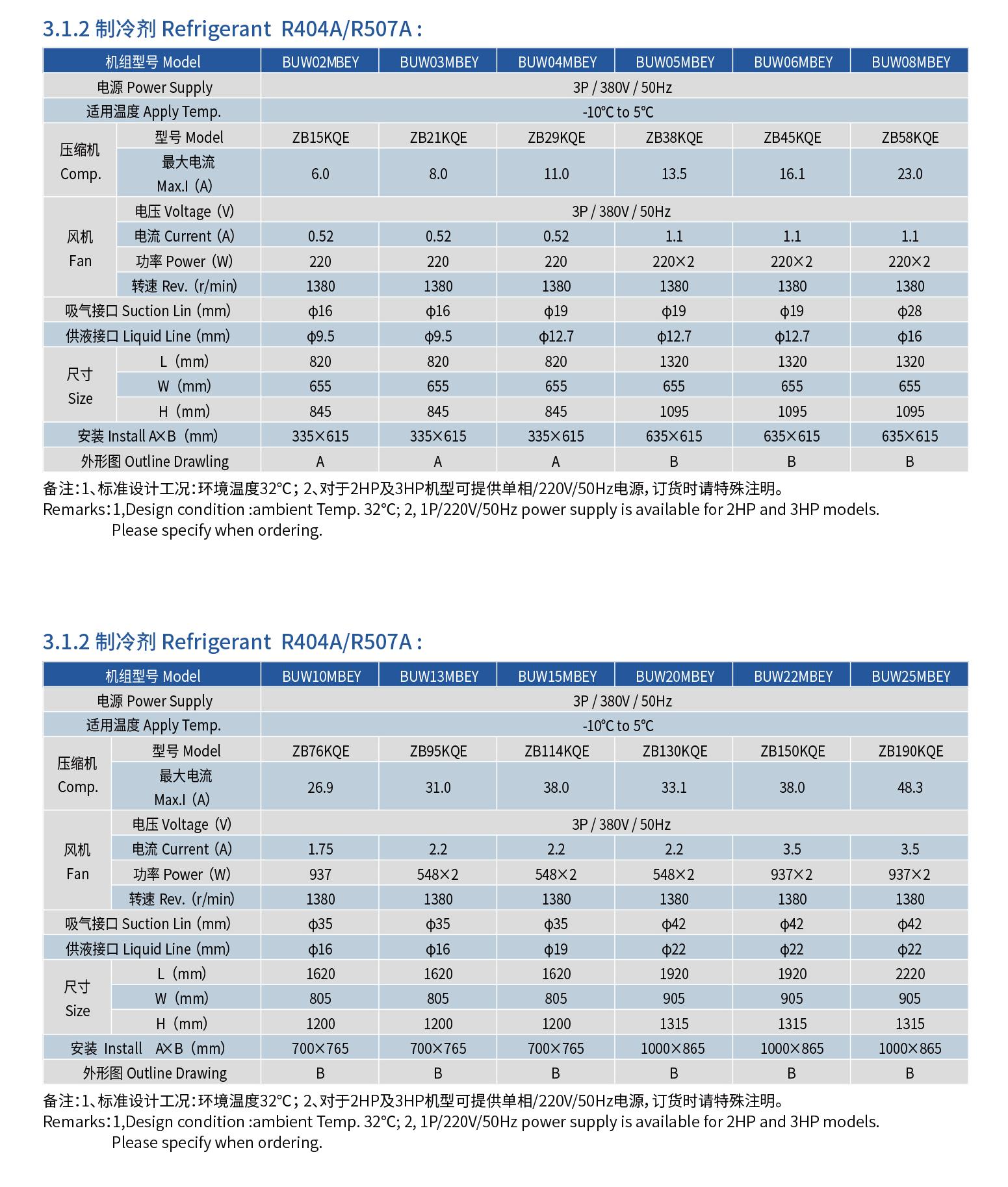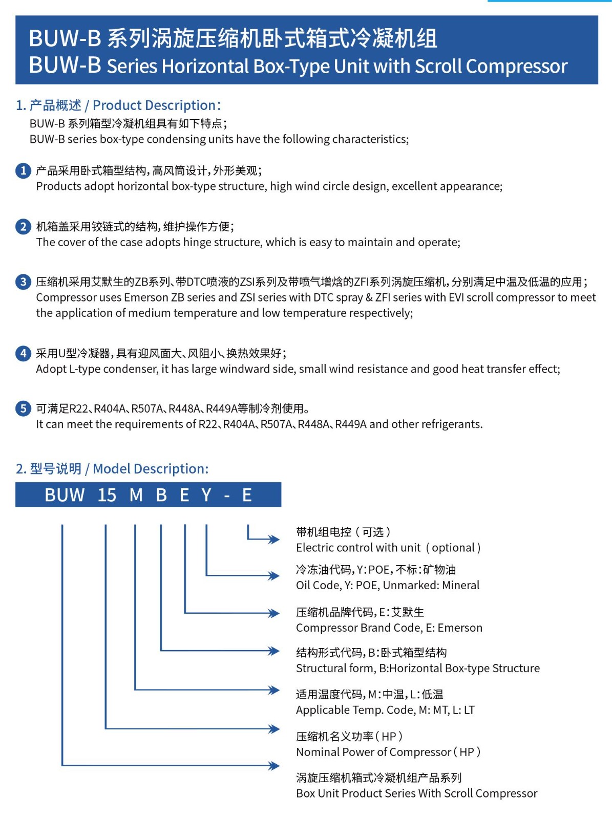 BUW-B系列 涡旋压缩机卧式箱式冷凝机组采用爱默生谷轮ZB全封闭压缩机,功率从2HP—10HP,使用6级电机,可分别满足于可分别满足于-5℃—10℃、-10℃—-18℃的需要,可广泛用于宾馆、饭店、食品、卫生、医药、农业、化工等行业。