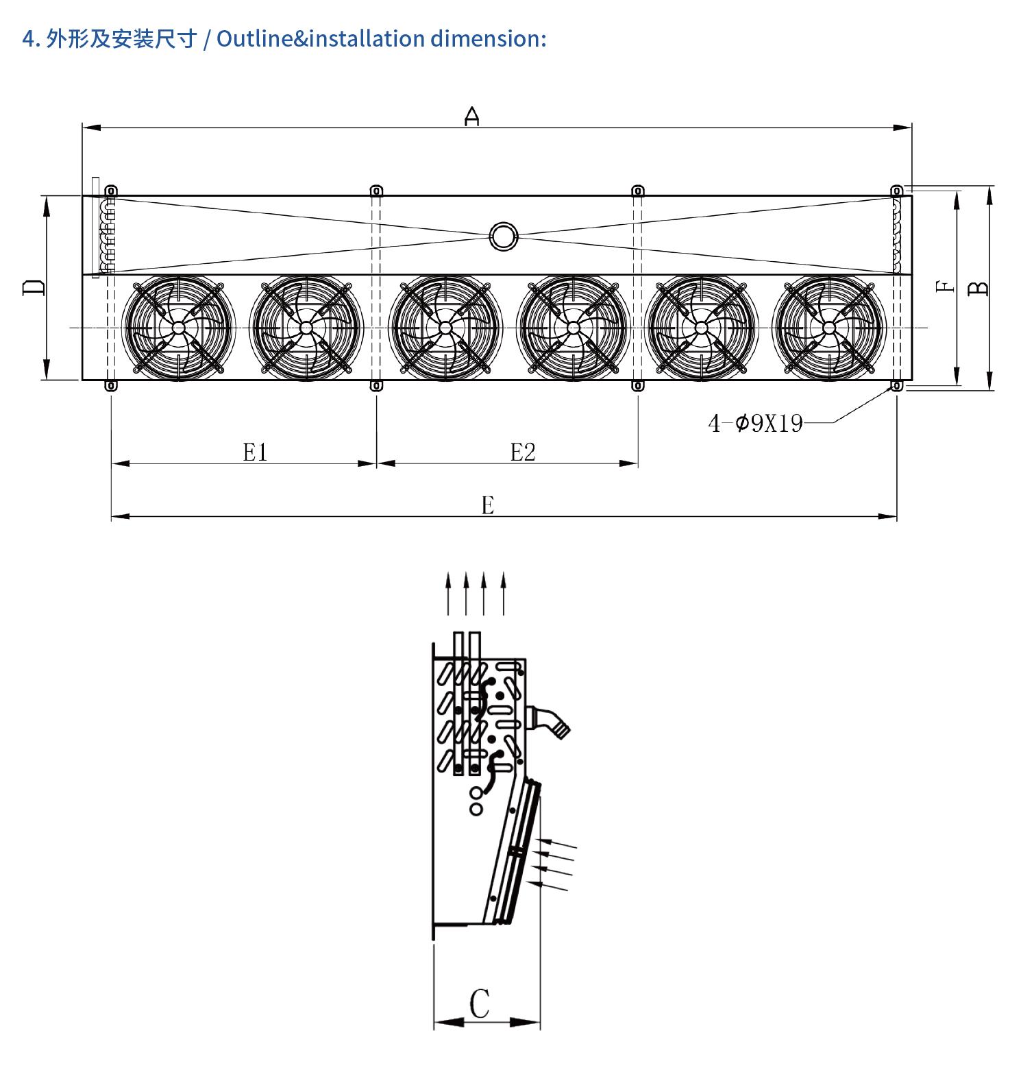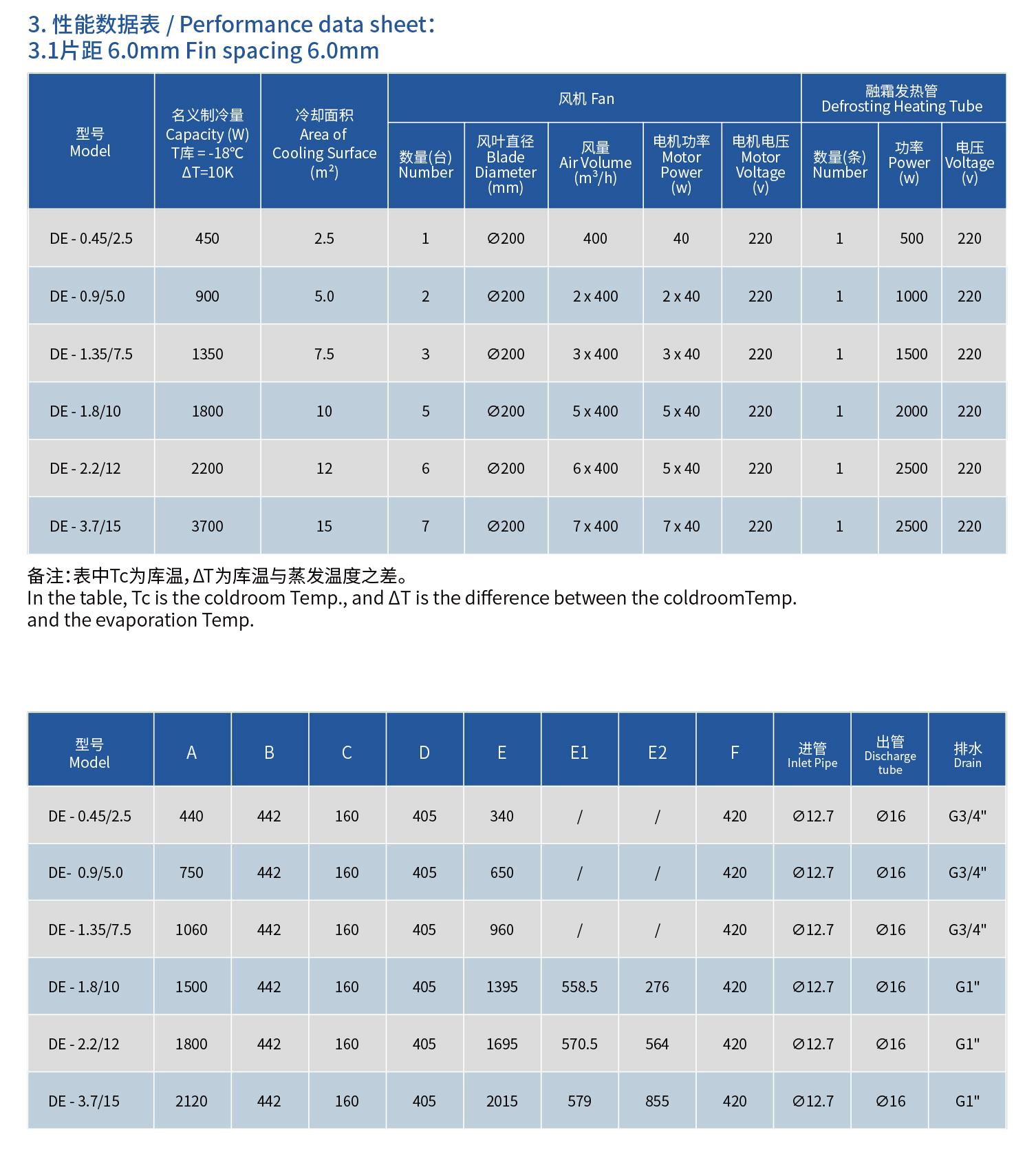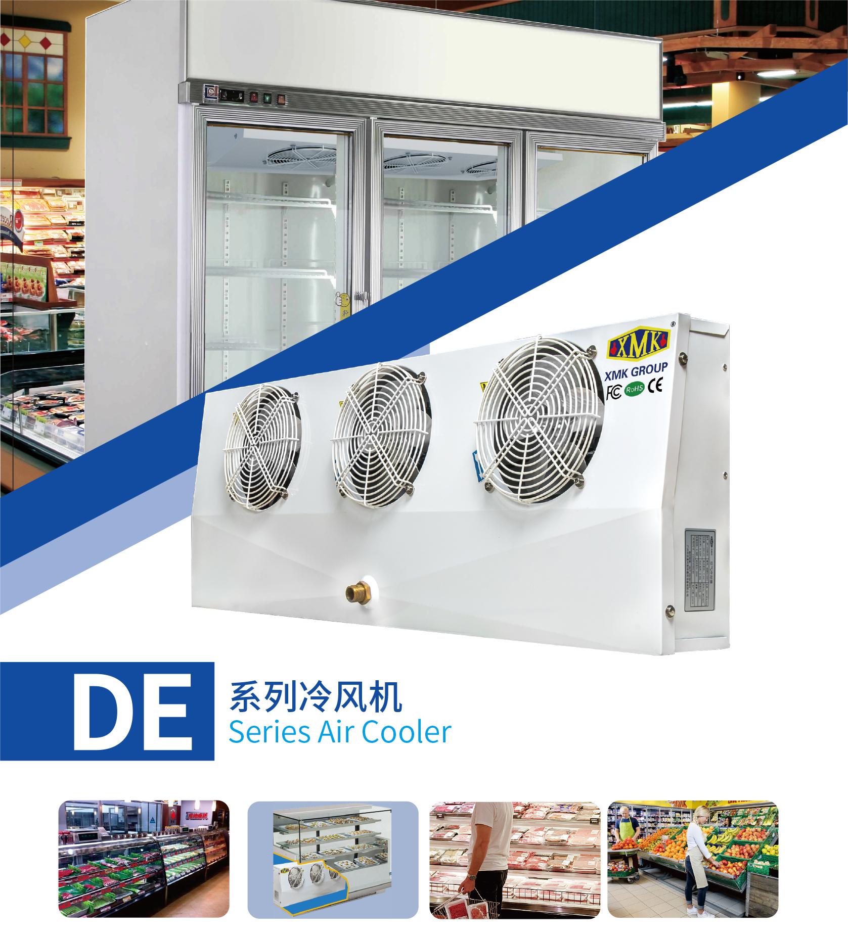 DE系列冷风机主要用于冷柜作为蒸发器使用。片距6.4mm其不仅适用于小型冷库,同时也适用于冷藏柜,并方便安装。