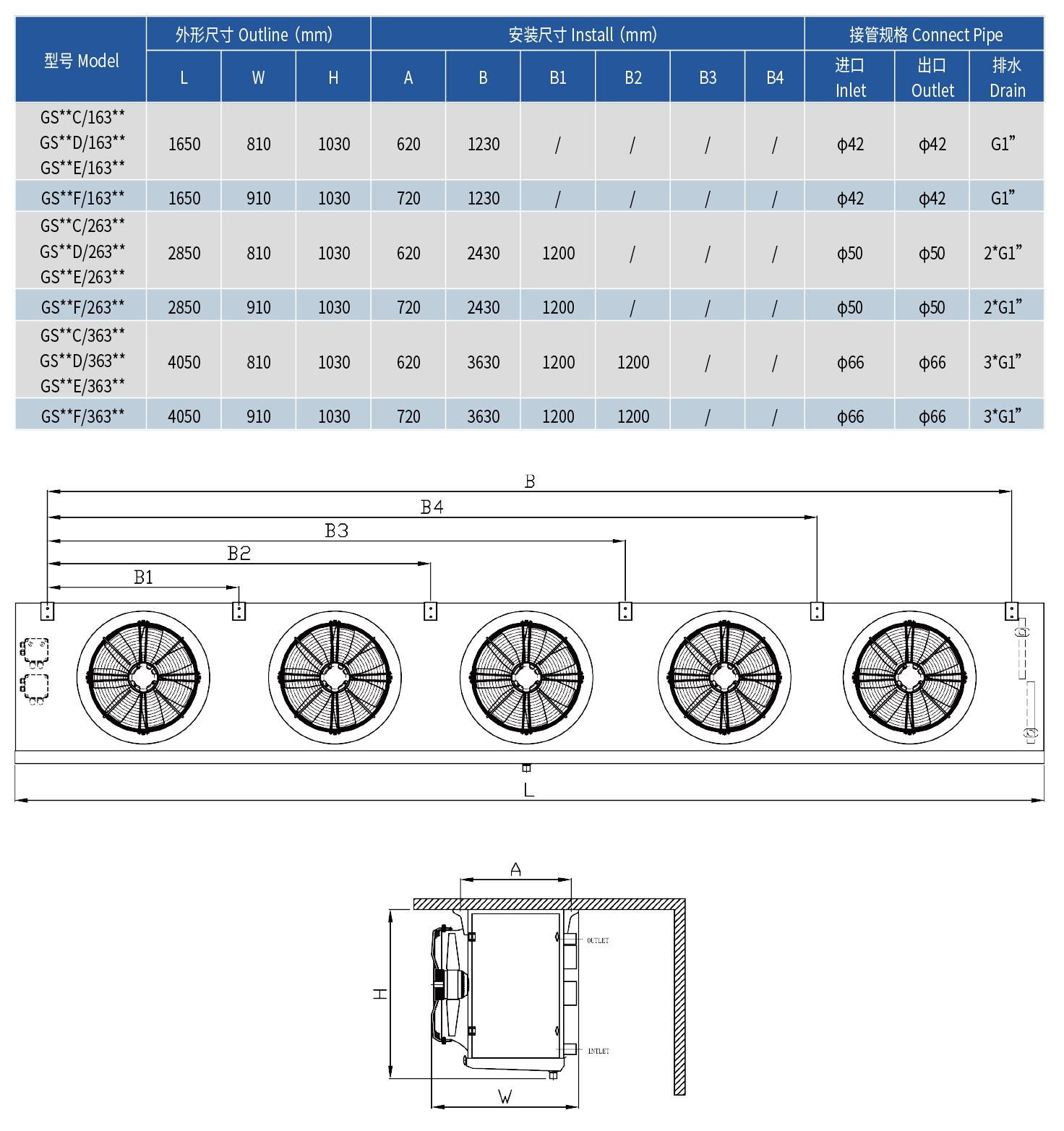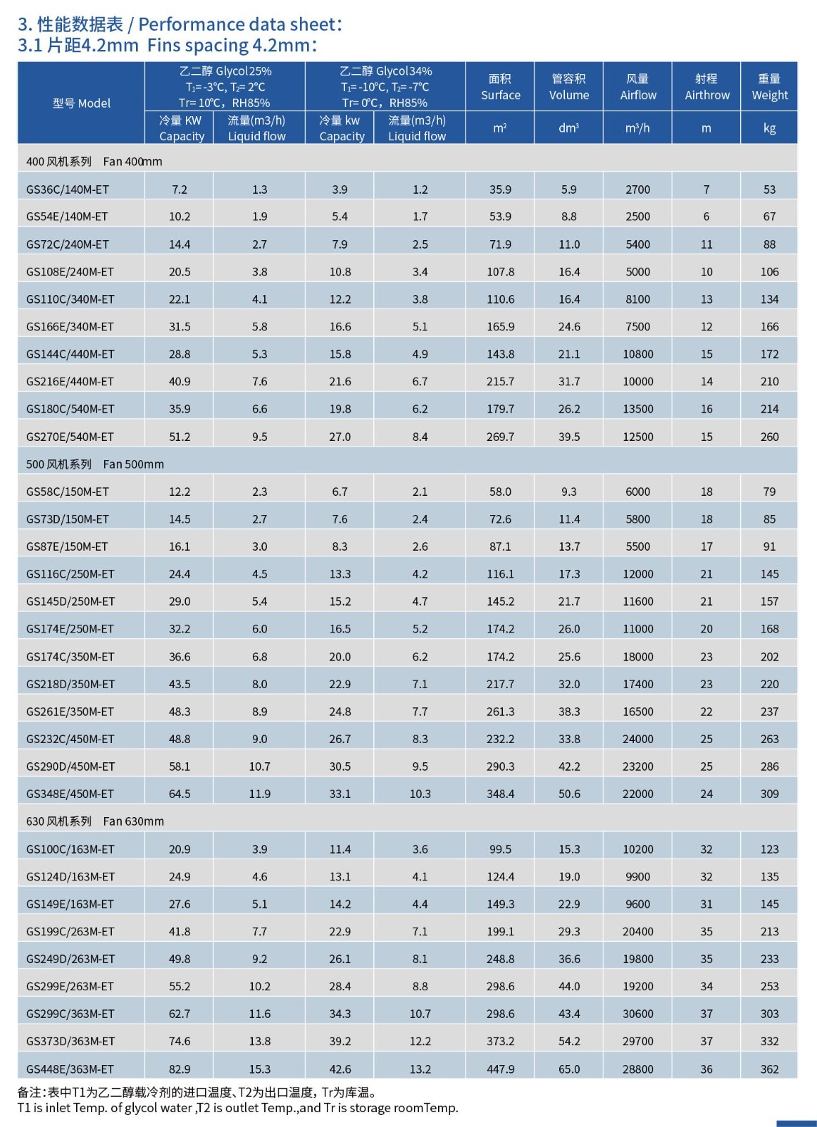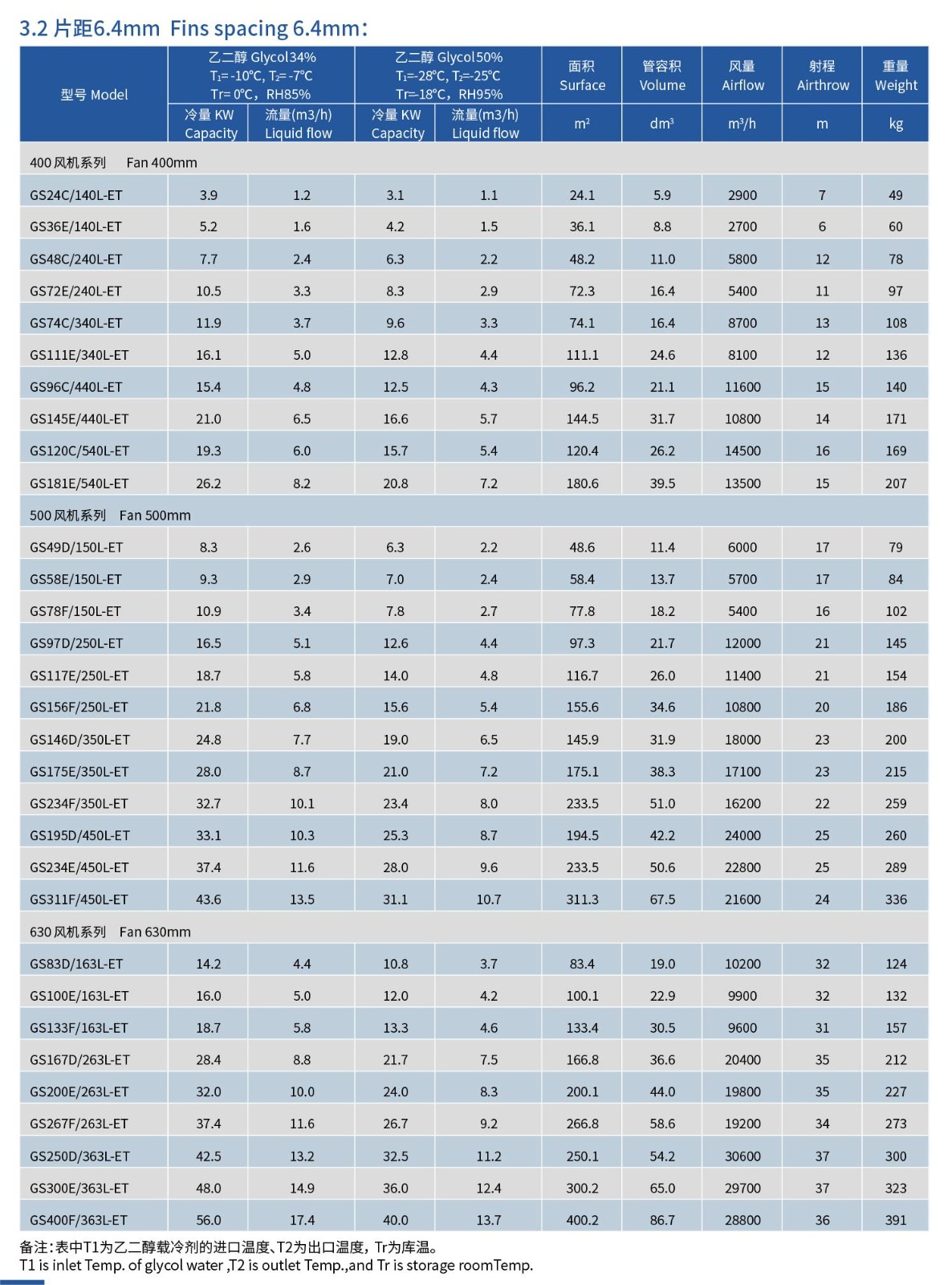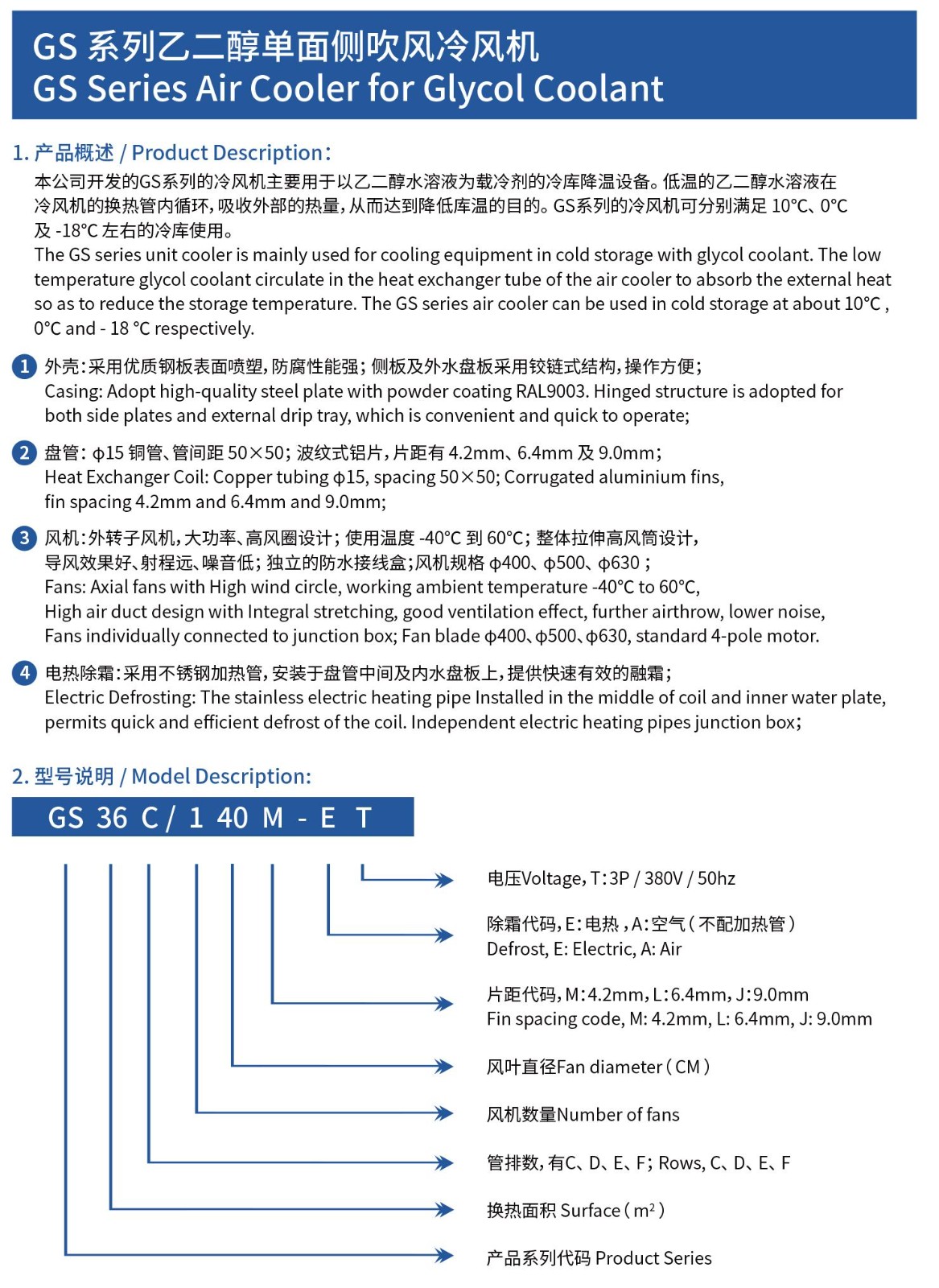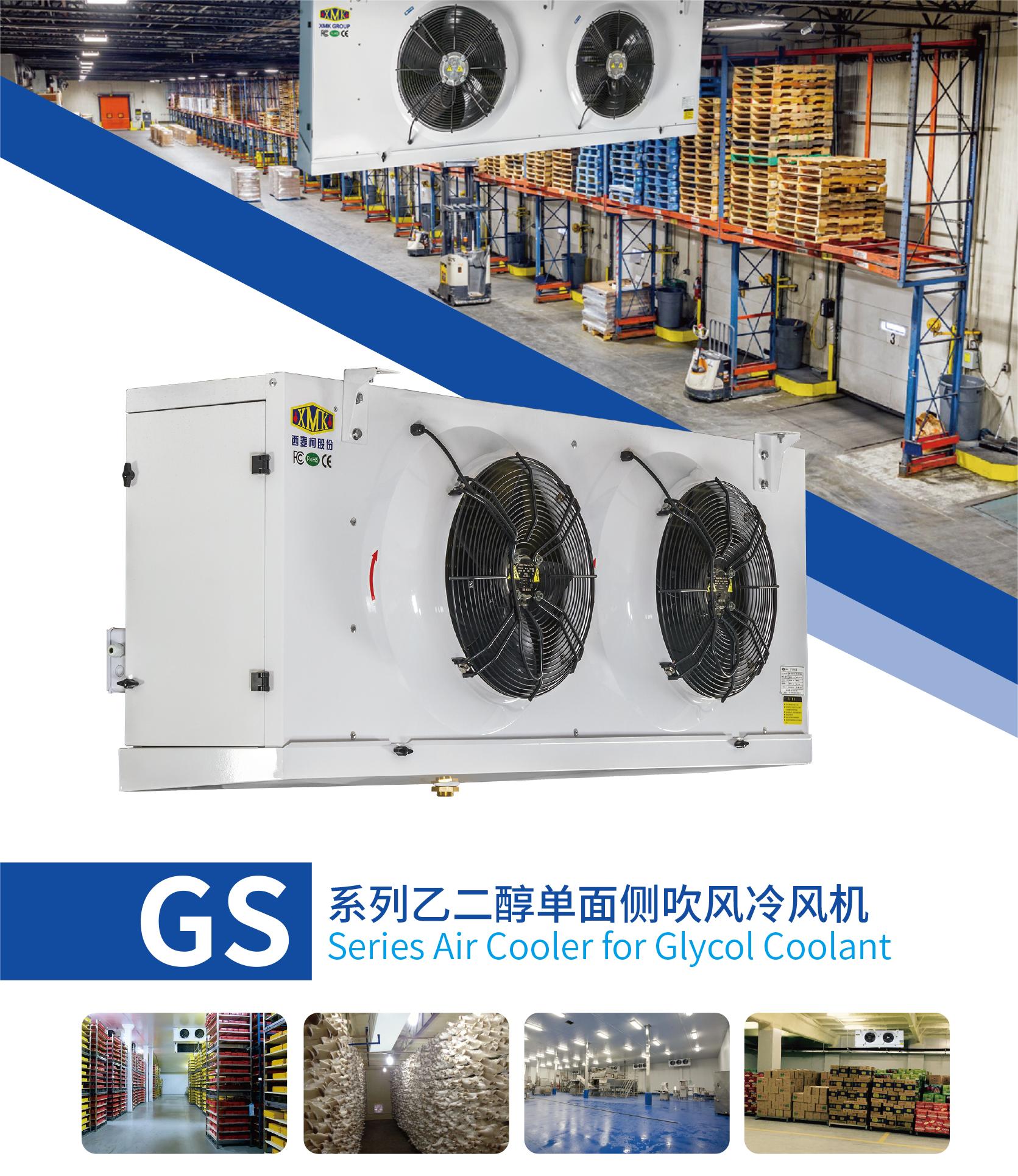 GS系列的冷风机主要用于以乙二醇水溶液为载冷剂的冷库降温设备。低温的乙二醇水溶液在冷风机的换热管内循环,吸收外部的热量,从而达到降低库温的目的。GS系列的冷风机可分别满足10℃、0℃及-18℃左右的冷库使用。