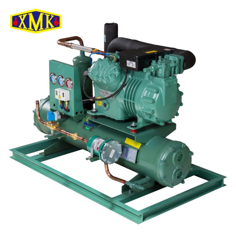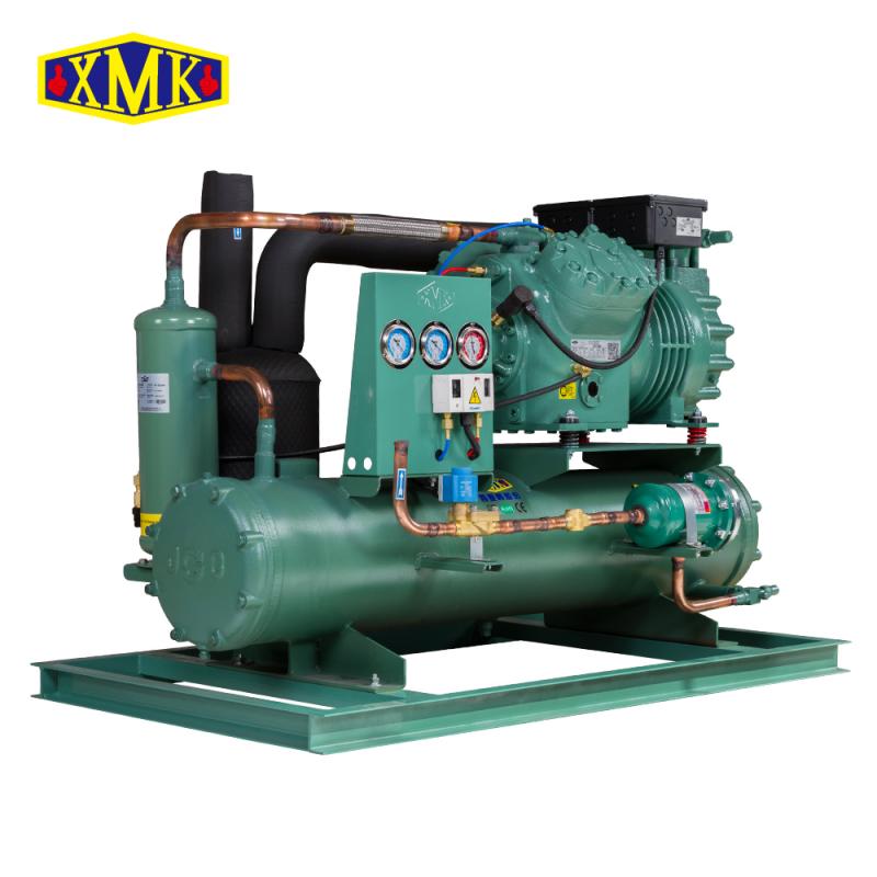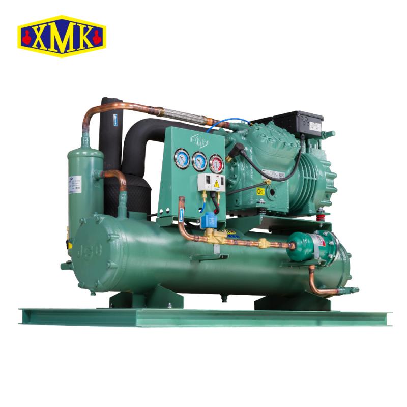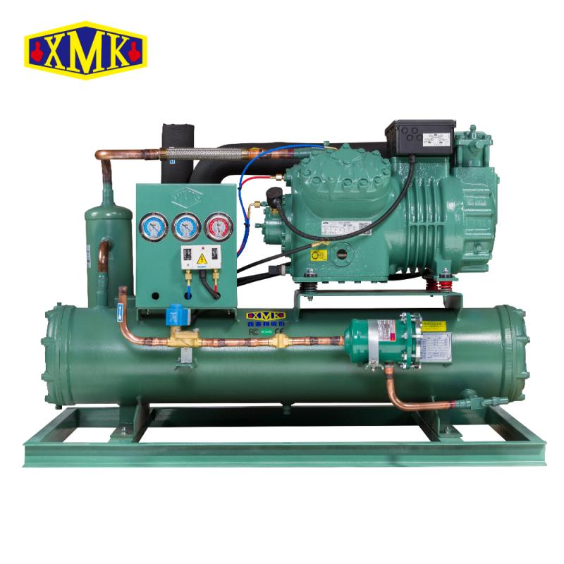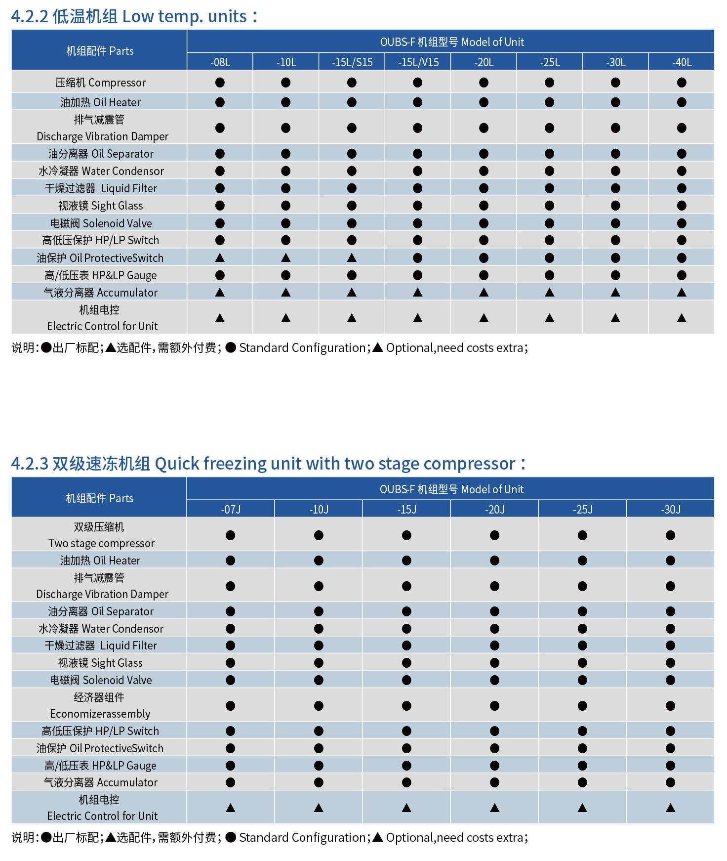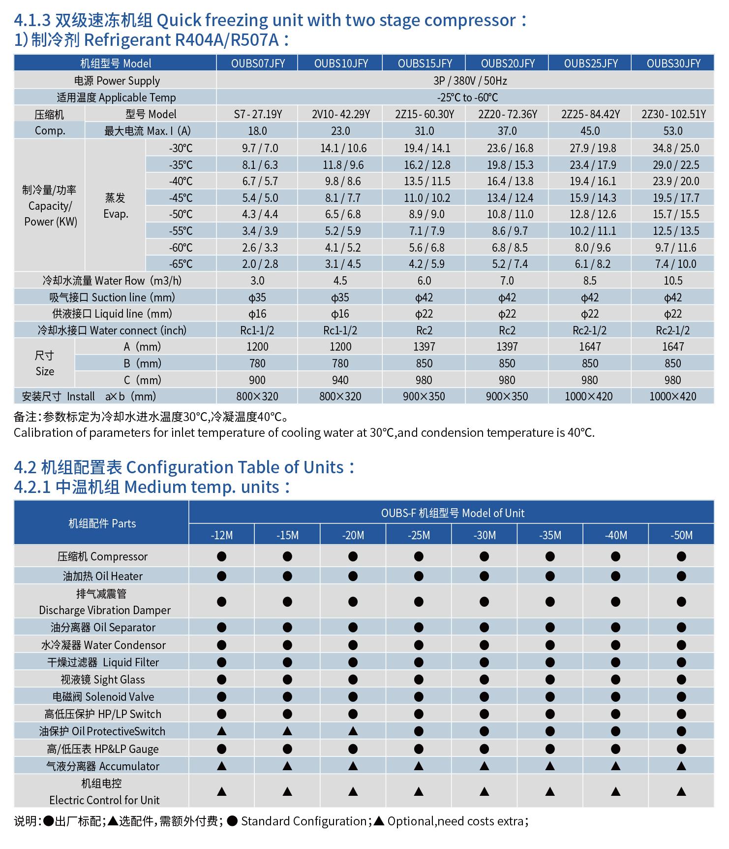 采用比泽尔或富士豪半封闭压缩机,水冷冷凝方式。中温:12-50HP;低温:9-44HP ;双级速冻:5-30HP。